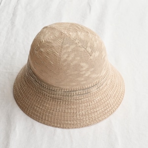 さらっとした肌触りと、透かし編みが清涼感を感じるコットンスラブハット。程よい深さのクラウンに、緩やかな傾斜のツバにすることで、すっきりとした印象に仕上げました。ランダムな太さの糸が生み出す編み柄と、トップとつばの切り替え編み柄もポイントです。