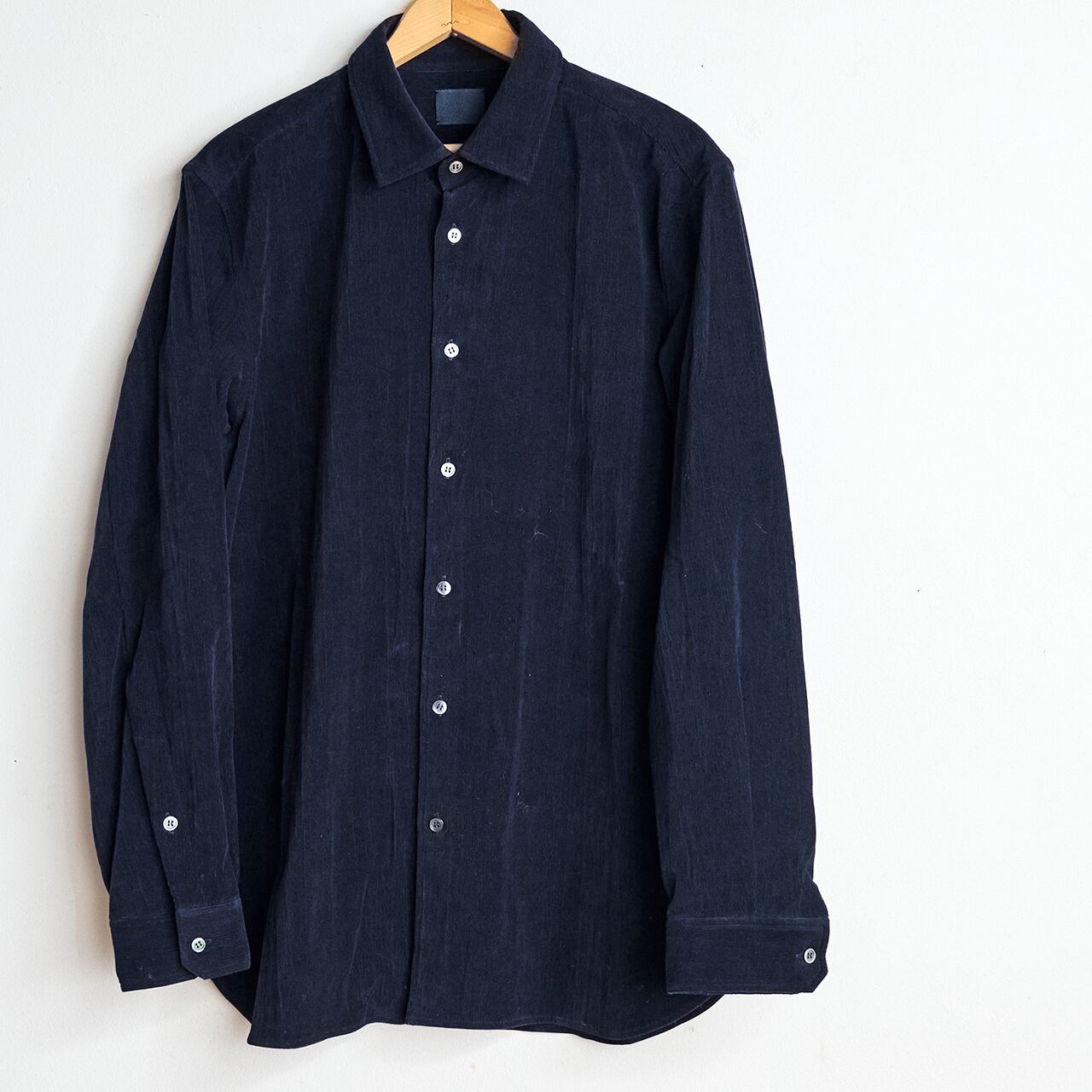 きちんとした佇まいの山内らしい仕上がりを見せるシャツ。粗野なイメージのコーデュロイも山内にかかれば贅沢で上品な出来上がりです。カラーはブラックにも見える深いネイビー