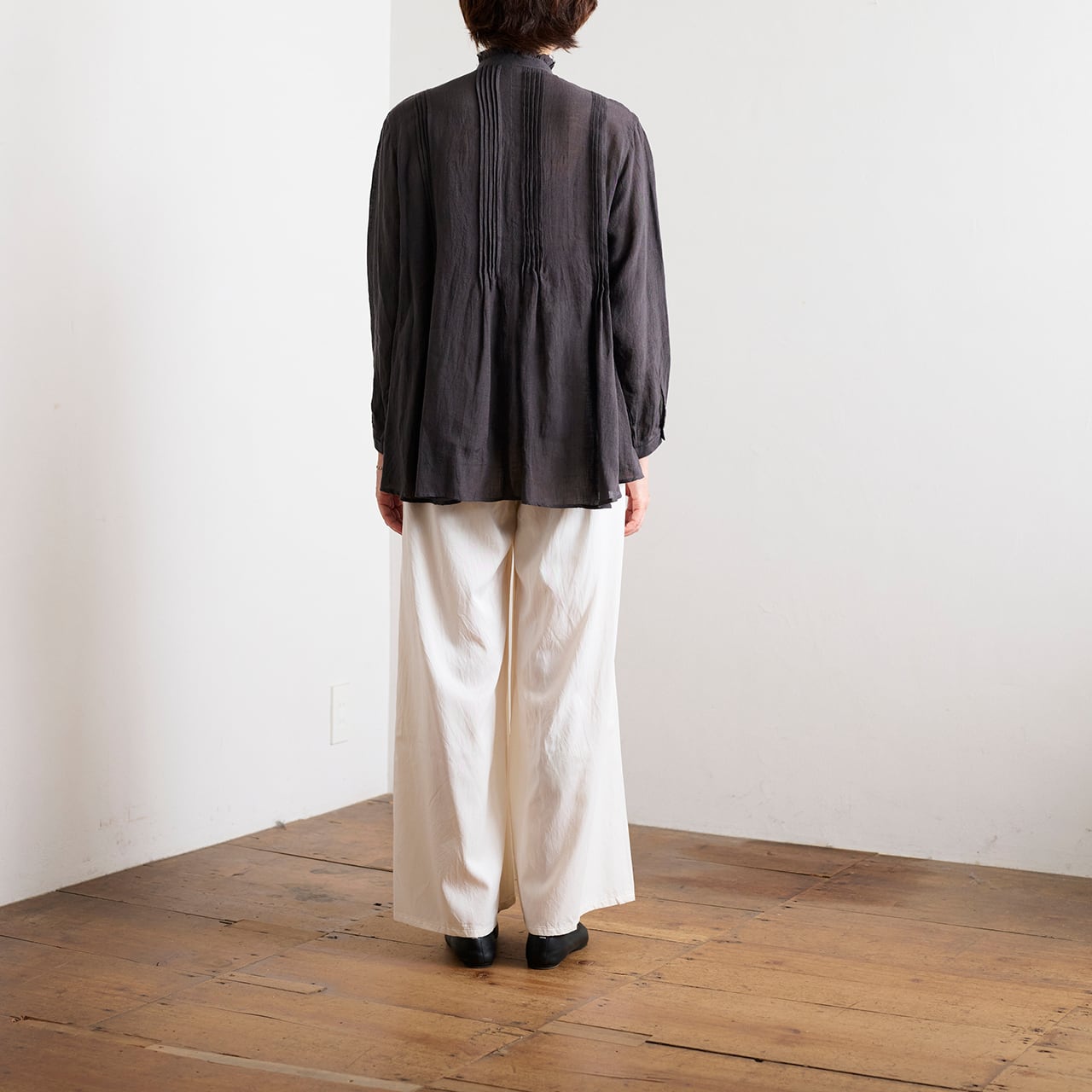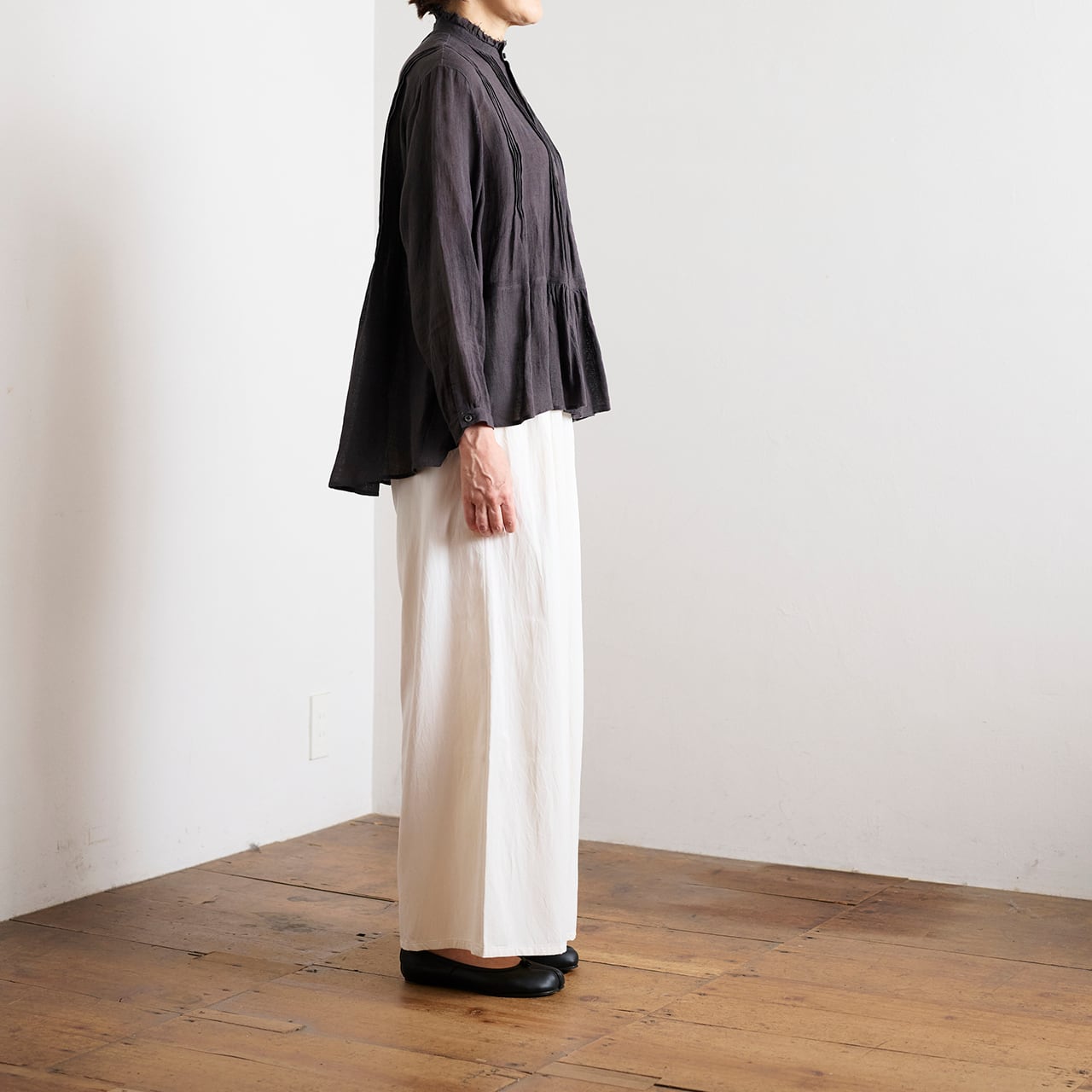 胸元に細かなピンタックを配し、上品なイメージのブラウスは繊細なリネン素材を使っておりますので、使うごとに身体に馴染み、柔らかく美しい風合いへ変化していきます。