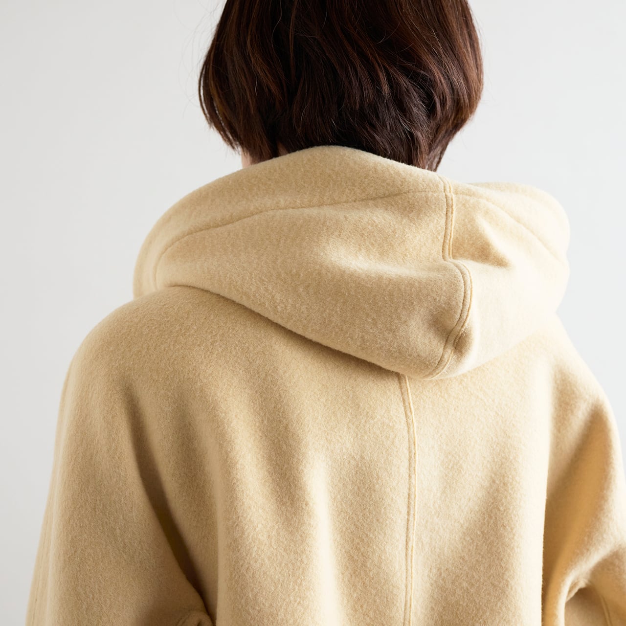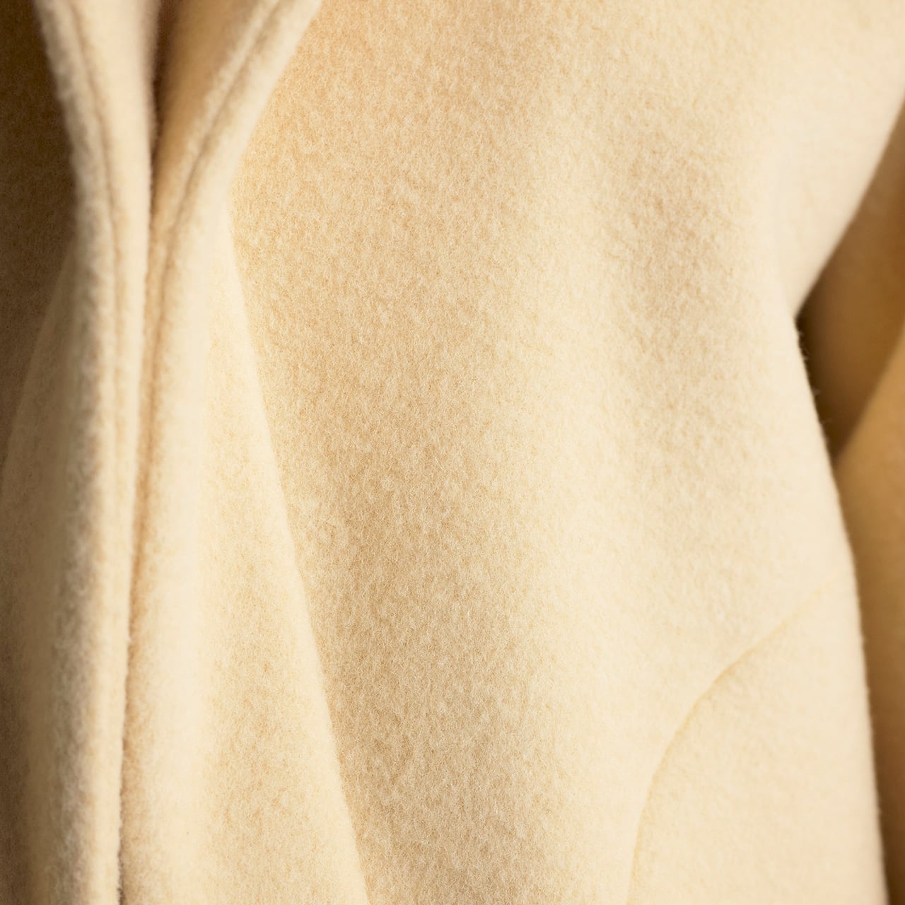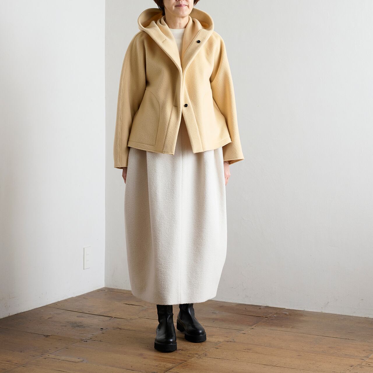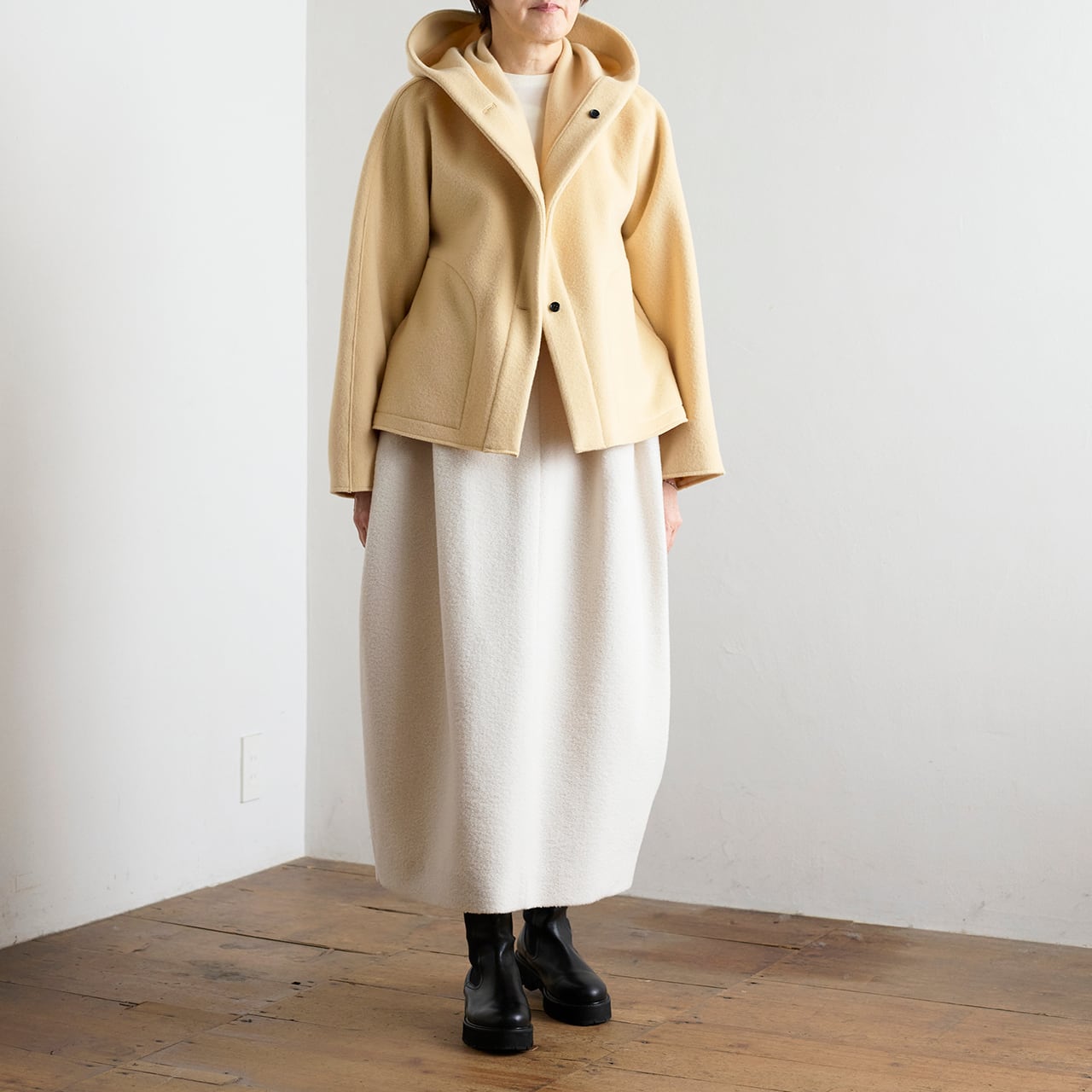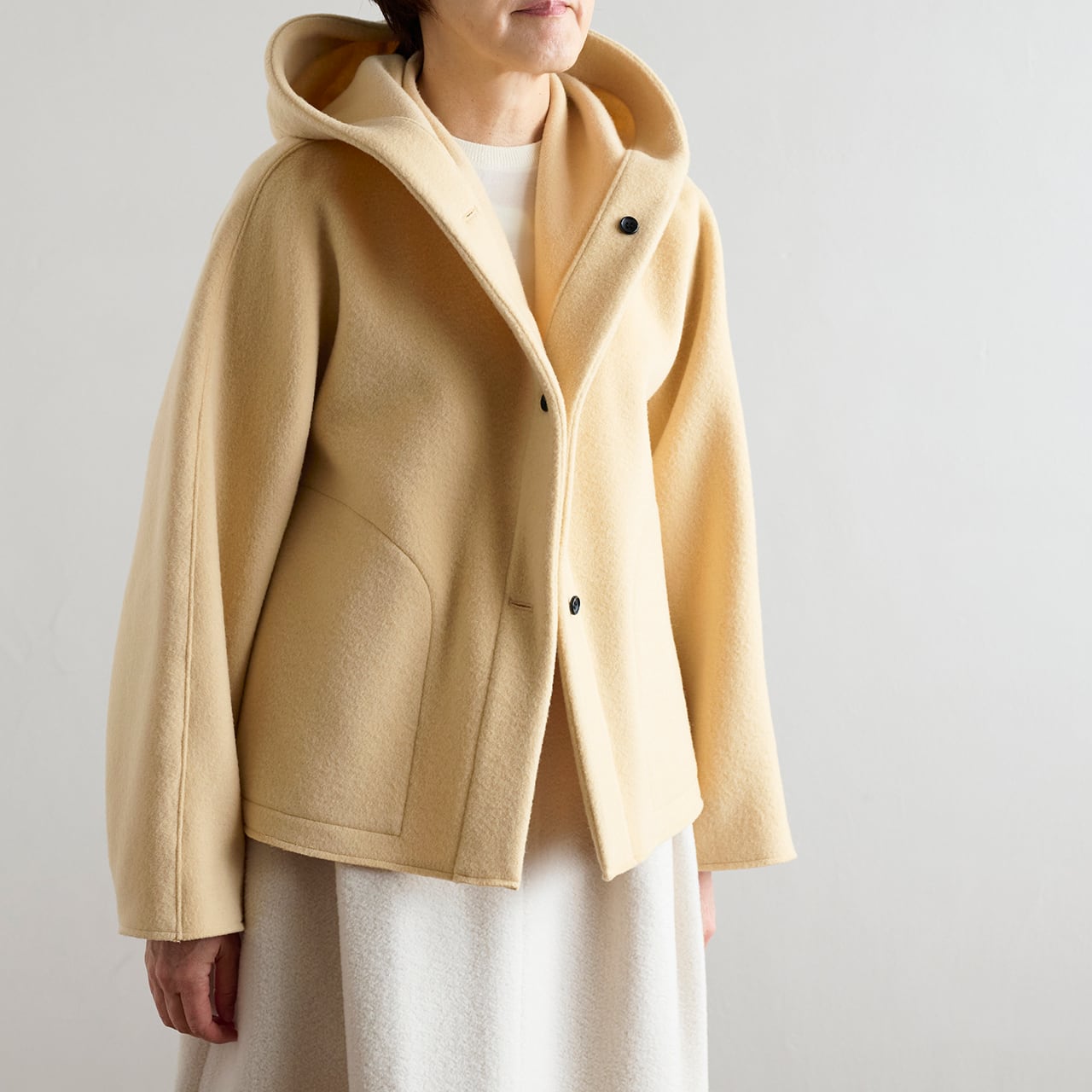 スーパーウール140Sで仕立てられたショートコートはキメの細いフェルトのような生地となり、軽くてなめらかなタッチ感です。裏地の無い一重仕立てで美しい仕上がりは技術の高さをうかがえます。