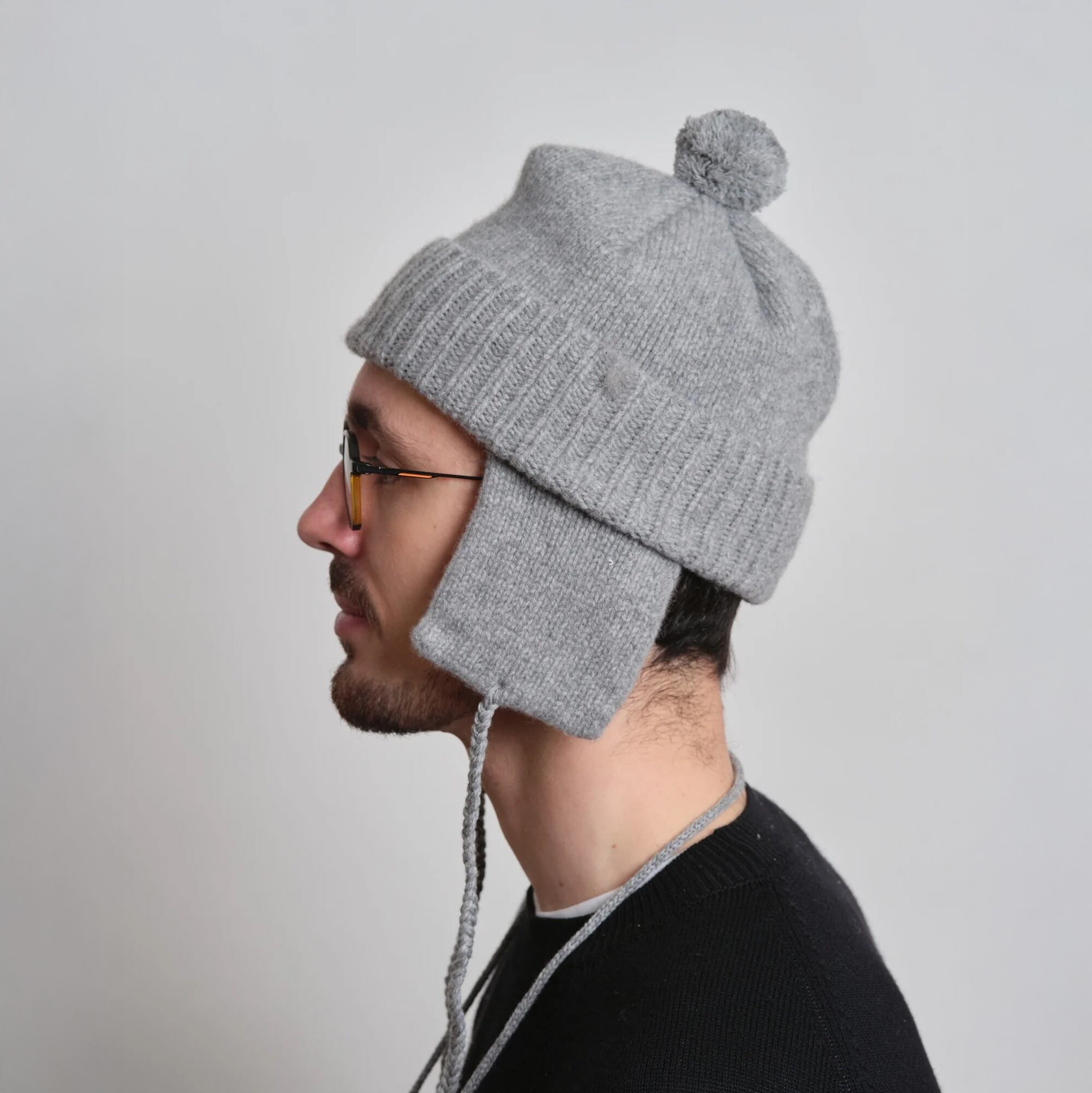 ふわっとした優しい風合いのエクストラファインラムズウールで編み立てたポンポンニット帽。