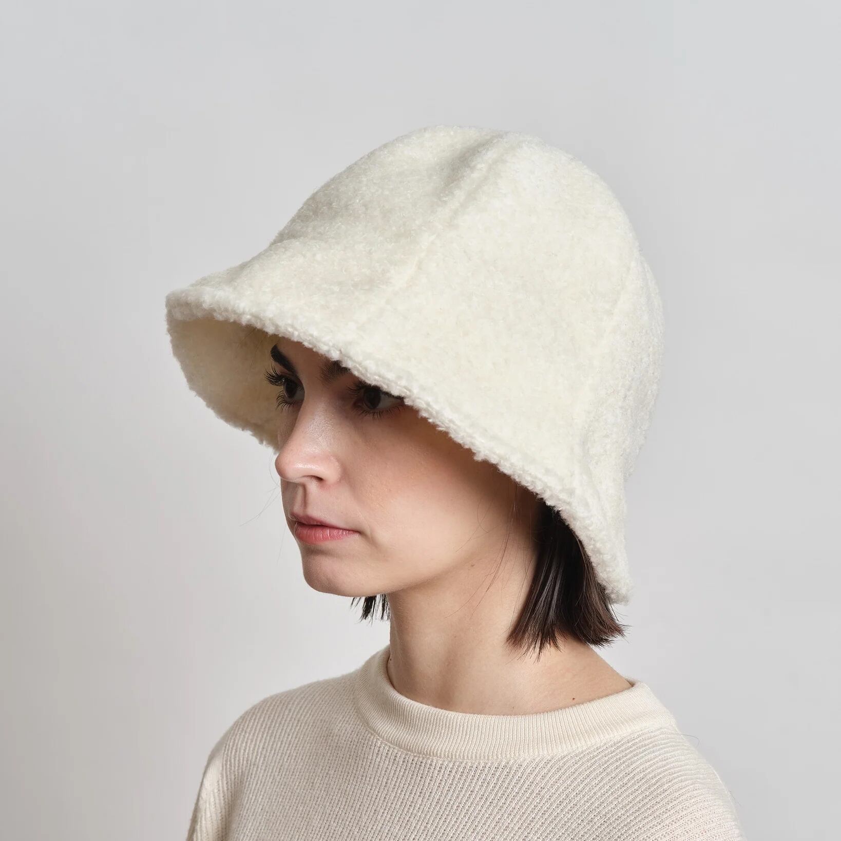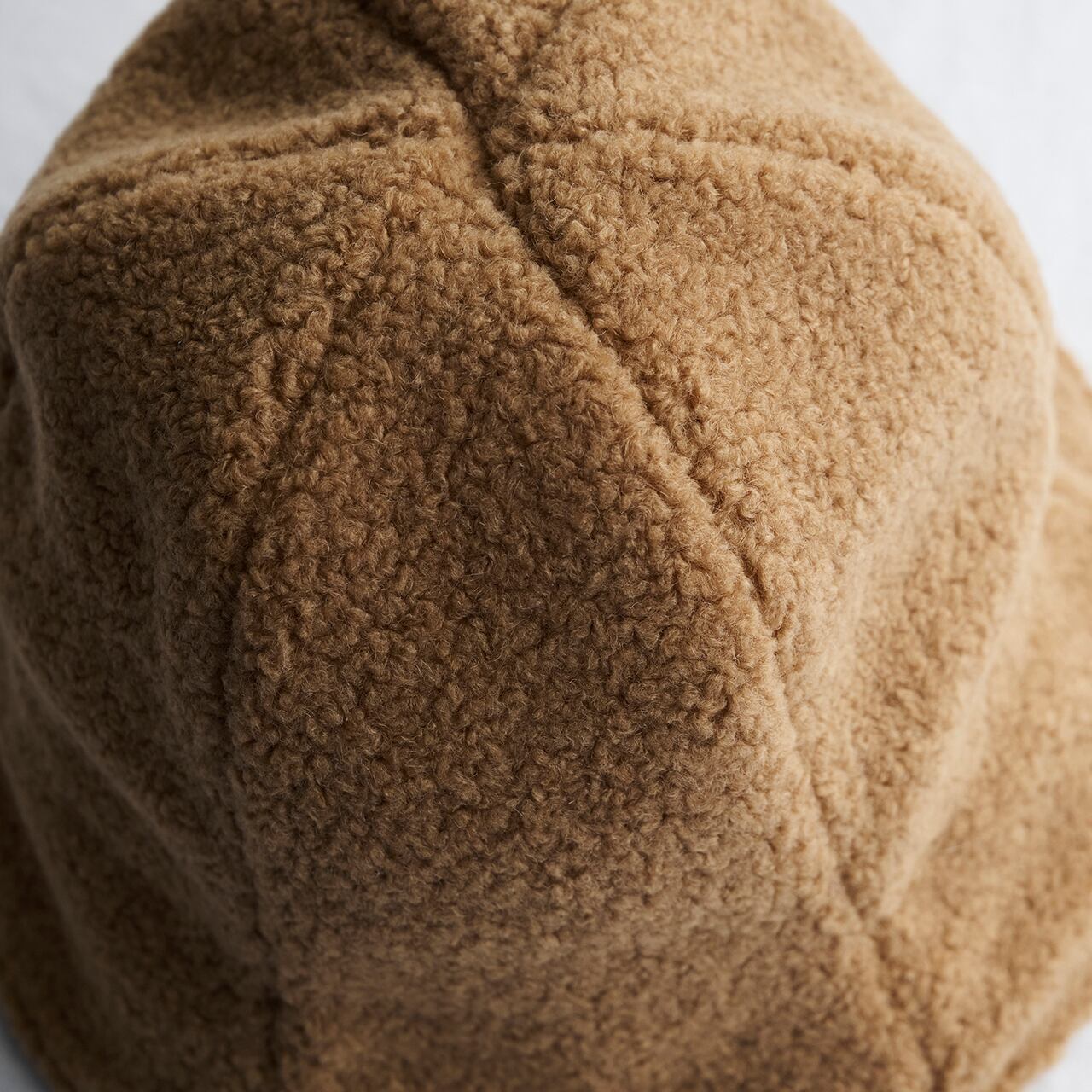 ツバの傾斜を緩やかにした、縦長のシルエットにすることで、ボアパイル生地のボリューム感を軽減させました。