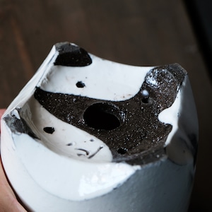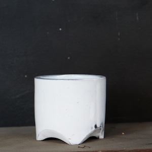 こちらの植木鉢はピジョンカップと同じように黒土にフランスの化粧土をかけて鈴木さんの理想とする白を表現しています。またところどころに下地の黒が透けて見えるコントラストが独特な表情です。