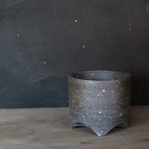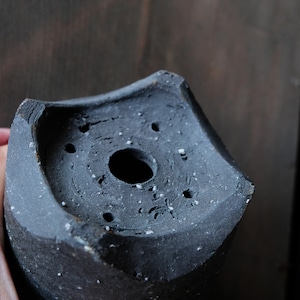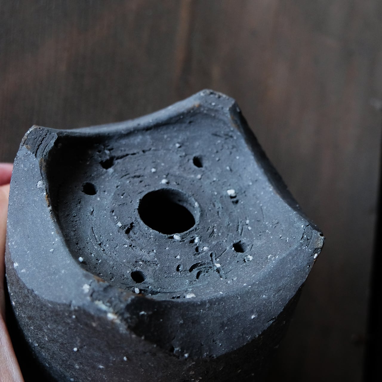 こちらは焼き締めで作られた少し野趣あふれる植木鉢です。鈴木さんの師である小野寺玄先生の黒に思いをはせながらお作りいただいたとの事です